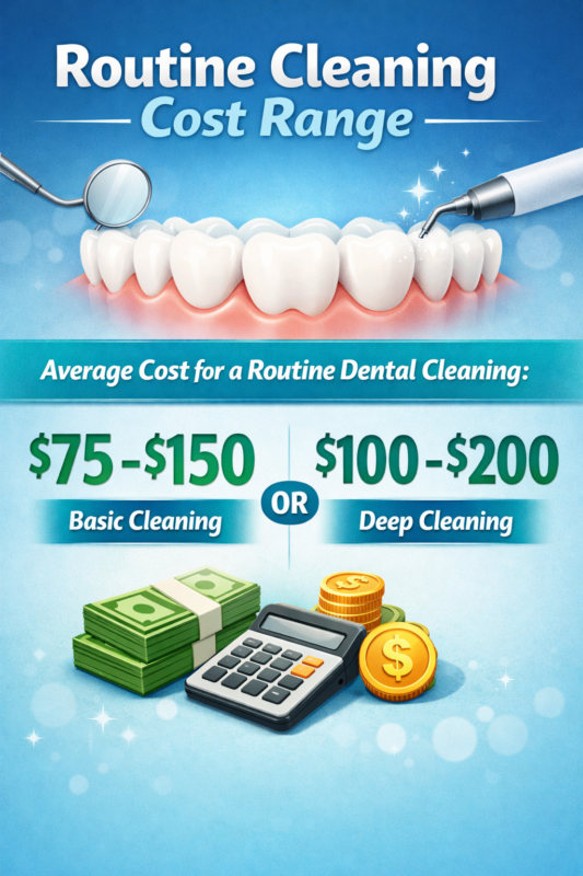 - Routine Cleaning (Prophylaxis): Costs $75 – $200. This preventive service removes plaque and tartar from above the gumline for patients with healthy gums.