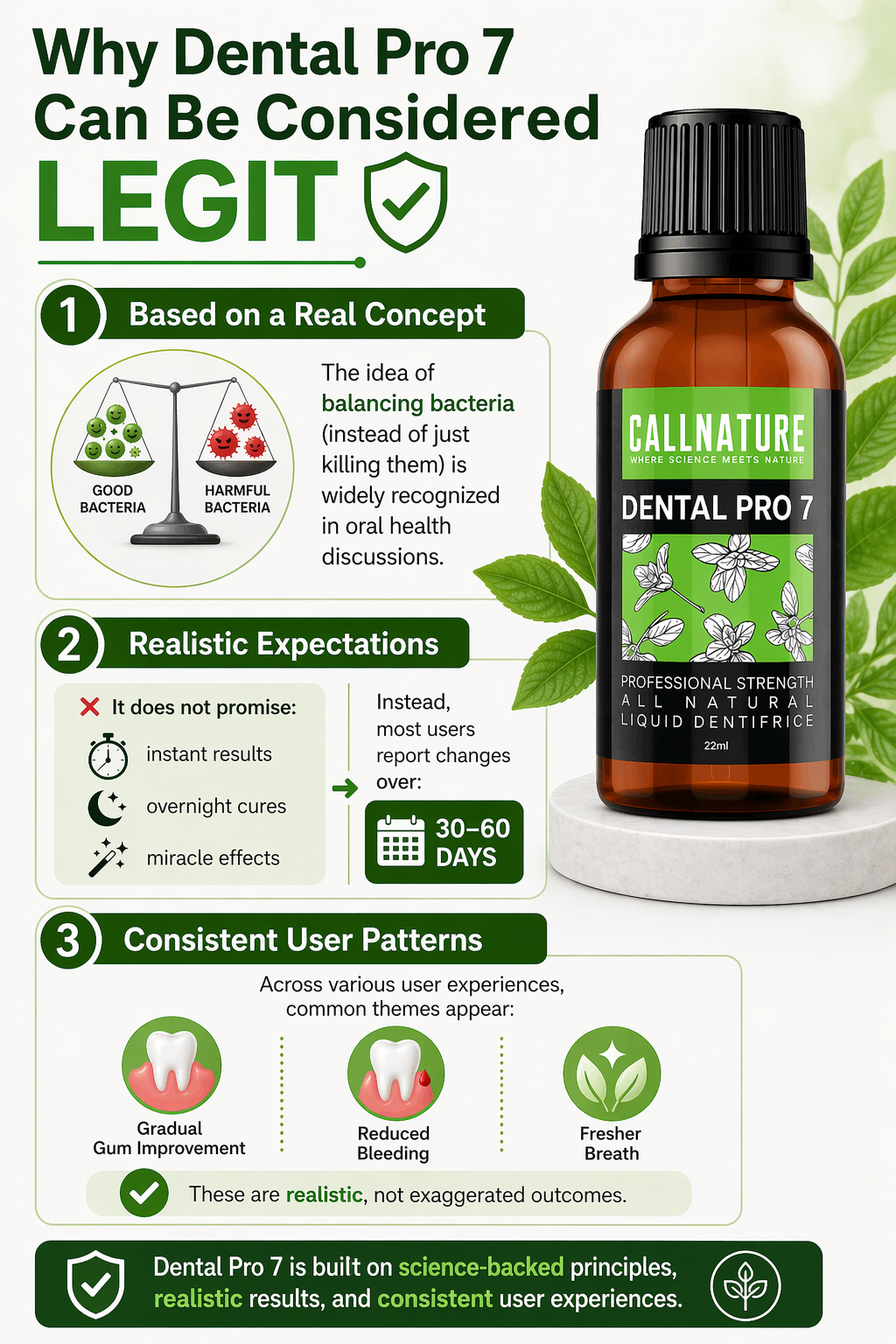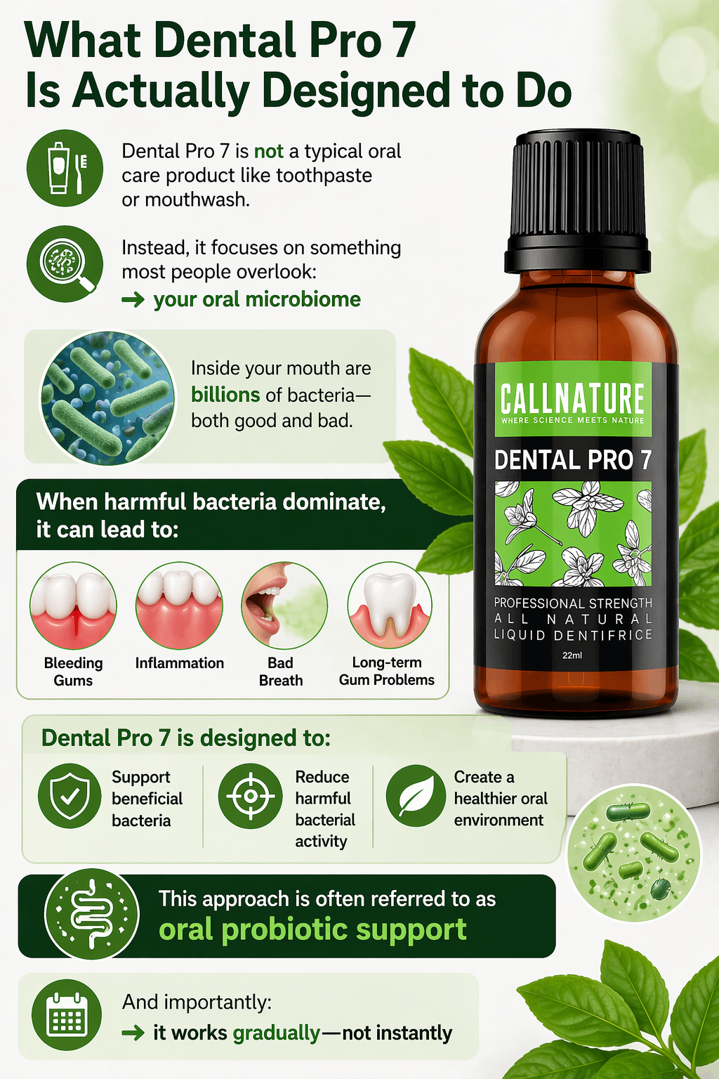 Dental Pro 7 is promoted as a probiotic supplement designed to support the oral microbiome. Unlike traditional oral care products that focus primarily on eliminating bacteria, probiotic-based formulas aim to introduce beneficial bacteria into the oral environment.