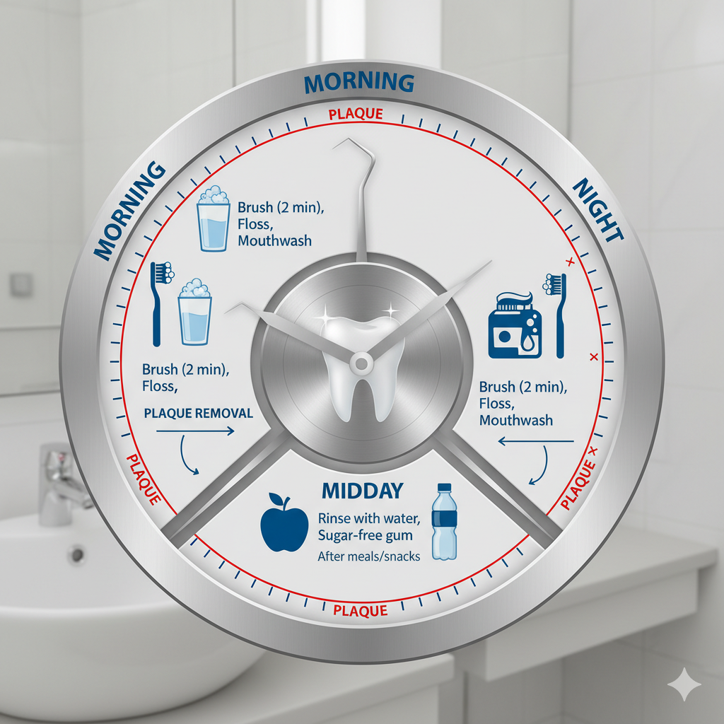 • Morning (After Breakfast): Brush for two minutes with fluoride toothpaste to remove overnight bacteria and food debris. Wait at least 30 minutes after eating acidic foods (like orange juice) before brushing to protect enamel.